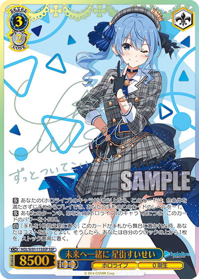 「未来へ一緒に 星街すいせい(SSP)」は、ホロライブプロダクションの人気VTuber、星街すいせいさんの魅力を詰め込んだヴァイスシュヴァルツのスペシャルカードです。箔押し加工と直筆風サインが施されたこのカードは、コレクターやファンの間で高い評価を受けています。その美麗なイラストと希少性から、投資対象としても注目されています。