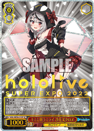 「(箔押し)キミと願うミライ 沙花叉クロヱ(SP)(HOL-WE36-31SP)」は、ヴァイスシュヴァルツのプレミアムブースター「ホロライブプロダクション」に収録された、沙花叉クロヱのサイン入りスペシャルカードです。